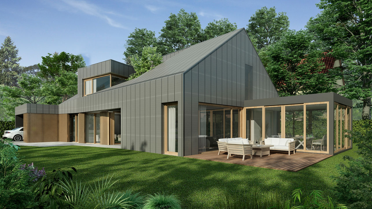This single-family house in Gockhausen explores a contemporary approach to sustainable living. A compact volume with a folded metal roof creates a unified architectural envelope that enhances energy efficiency while giving the house a clear and distinctive identity.